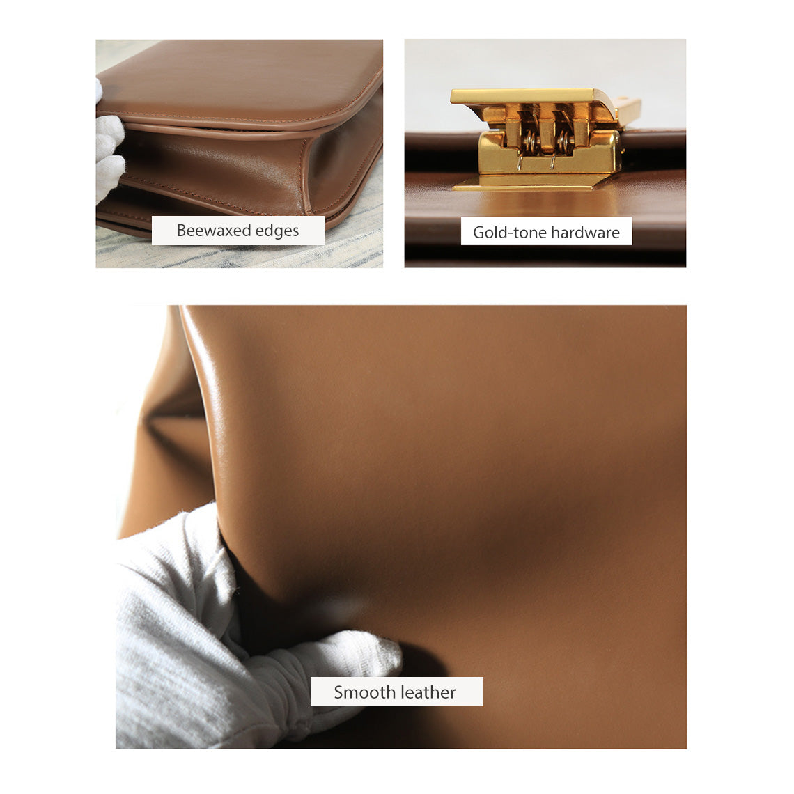 The inspired box bag just has every classic element that the classic piece has. The inspired designer bag is made from smooth leather and saffiano texture leather. Thanks to an adjustable and detachable shoulder strap, you can wear it as a crossbody bag or sling it on your shoulder. The bag can easily turn into a clutch bag as well. The bag has 4 colors available, which matches all seasons.