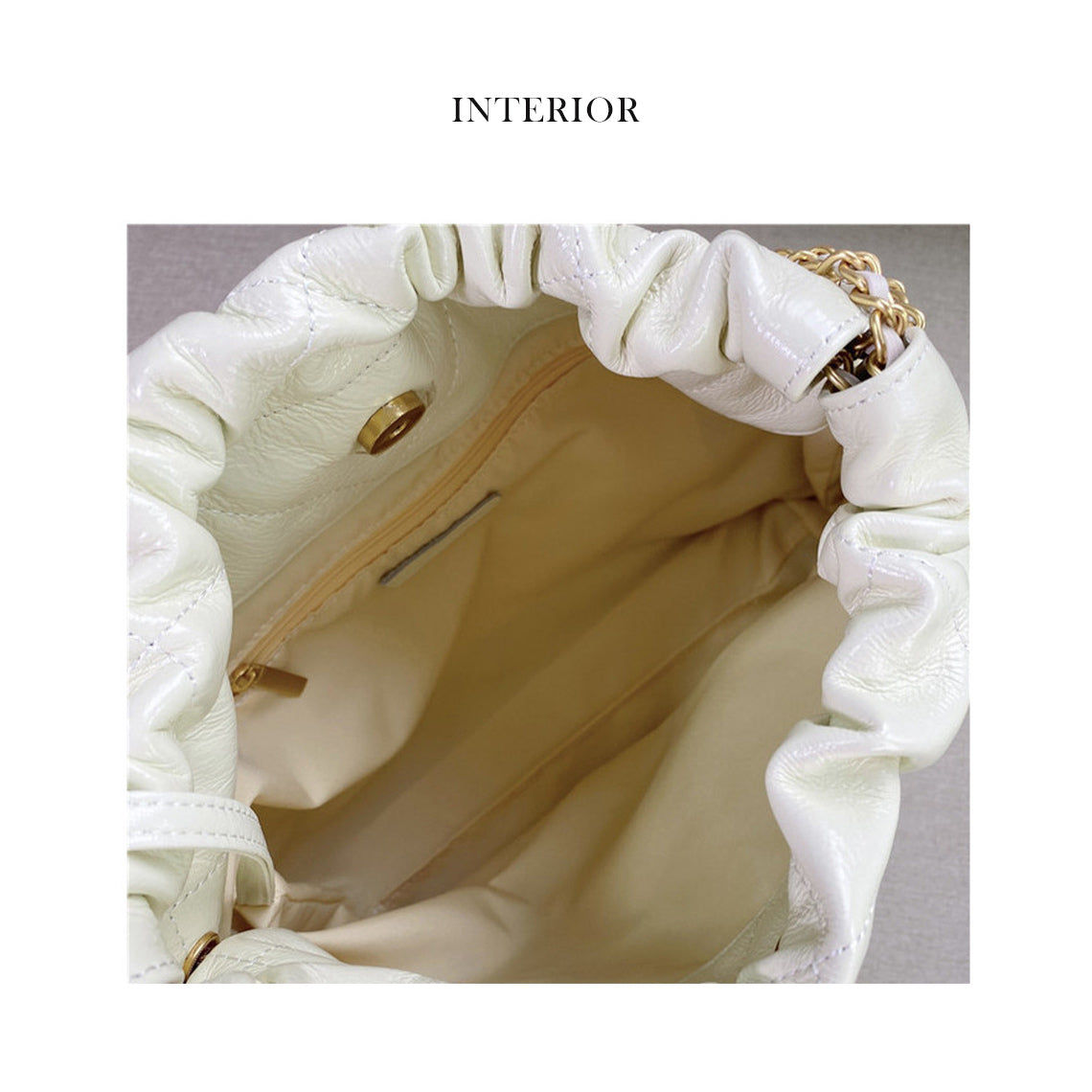 Featured supple diamond quilted smooth leather and woven chain leather strap for shoulder carry, this bag is ideal and comfortable to wear. It is also a fun and functional bag, thanks to its drawstring closure that makes it easier to get your stuff in and out in a jiffy. Available in classic black color that can fit most your daily outfits. The medium size can store your everyday items. If you are looking for a on trend and casual bag to carry, then go for it.