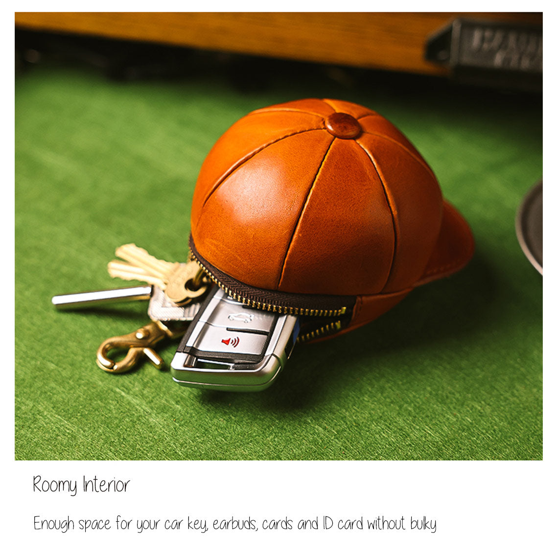 This vegetable-tanned leather baseball cap purse is the perfect carrying solution for your AirPods. A secure zip closure provides dependable protection for all your everyday essentials. The solid brass hook makes it easy hang it on your jeans or bag. The unique AirPods holder makes it easy to keep track of your pods while on the go.