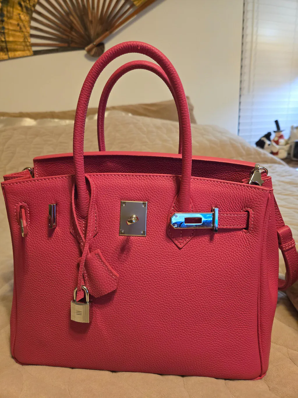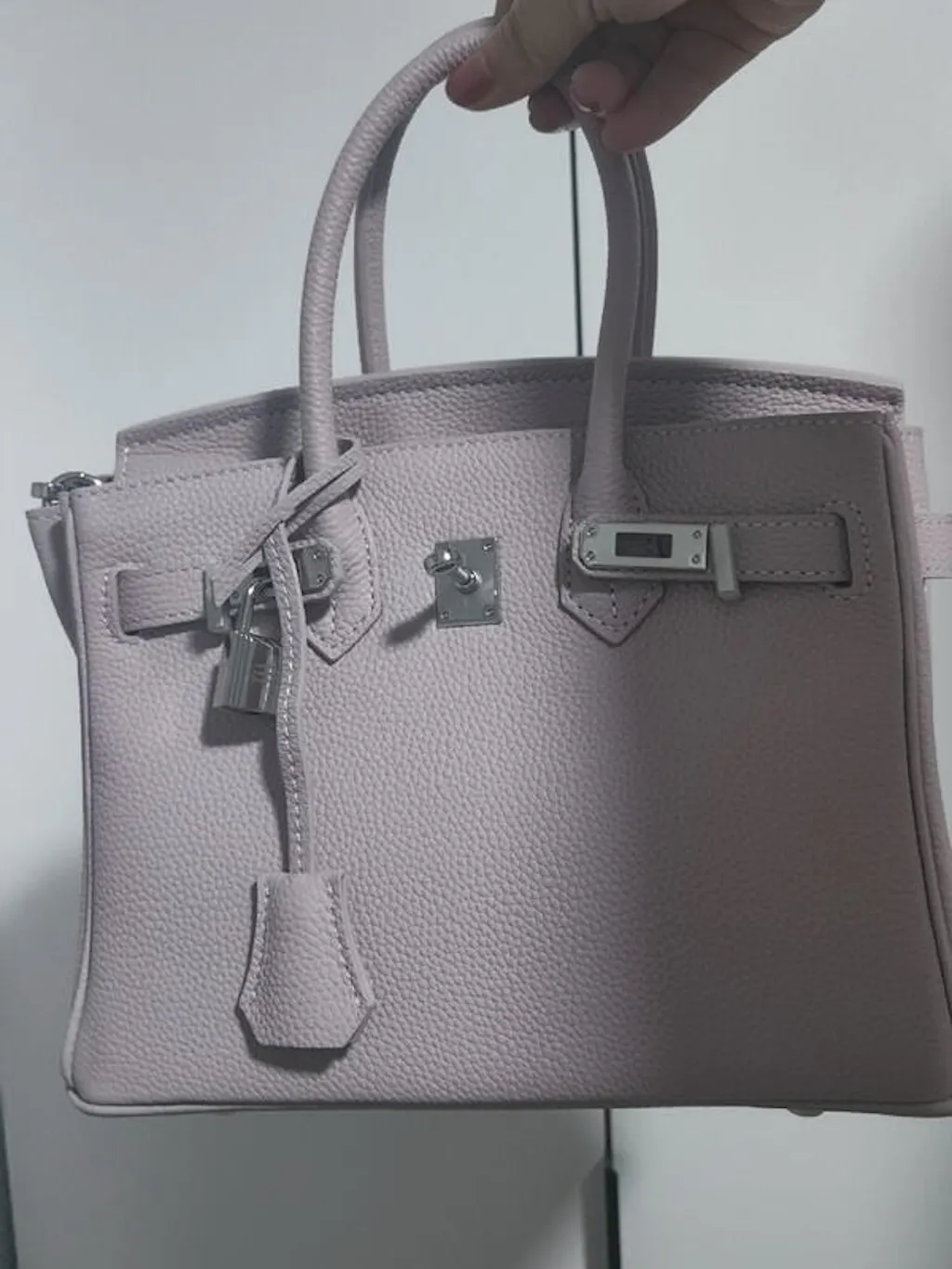This handbag inspired by the berkin bag. It is made from Togo top grain leather (real leather), this is a classic and timeless inspired berkin handbag. Featuring the iconic gold-tone twist lock and double rolled handles, it just has everything you can imagine for a luxury inspired berkin bag. With an adjustable strap, you can carry it smartly. The handbag is available in most popular 20, 25 and 30 sizes which is perfect for daily carry. The spacious interior compartment has one main compartment and 1 zipper pocket, 1 slide pocket, enough to store all your day-to-day belongings like cash, cards, makeup, purses, important bills, etc.