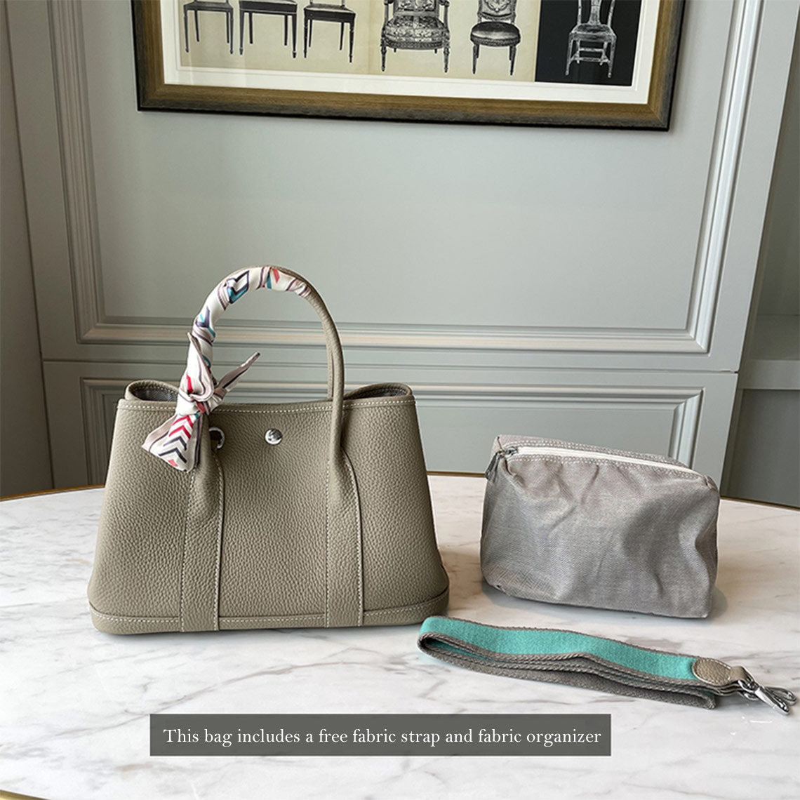 The inspired garden party handbag is made from genuine togo leather, which is soft, durable. It comes in colors: taupe, black and brown, all of them are popular and perfect for daily carry. A nonadjustable fabric strap in 106 cm will comes with the bag. The interior structure is quite simple for it only has one main compartment and 2 pockets.