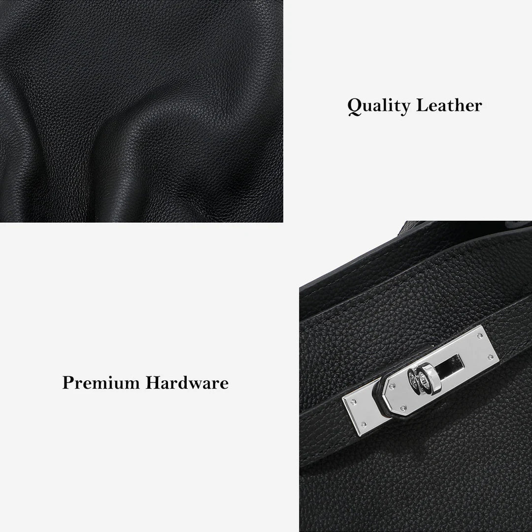 Love at first sight - this Top Grain Leather inspired Kelli Bucket Bag is the perfect mix of style and function. Crafted from soft and durable pebbled grain leather with iconic flap lock, it comes with an adjustable strap, so you can carry it your way. Choose from 4 versatile colors: classic black, warm brown, taupe and white. Don't miss out!